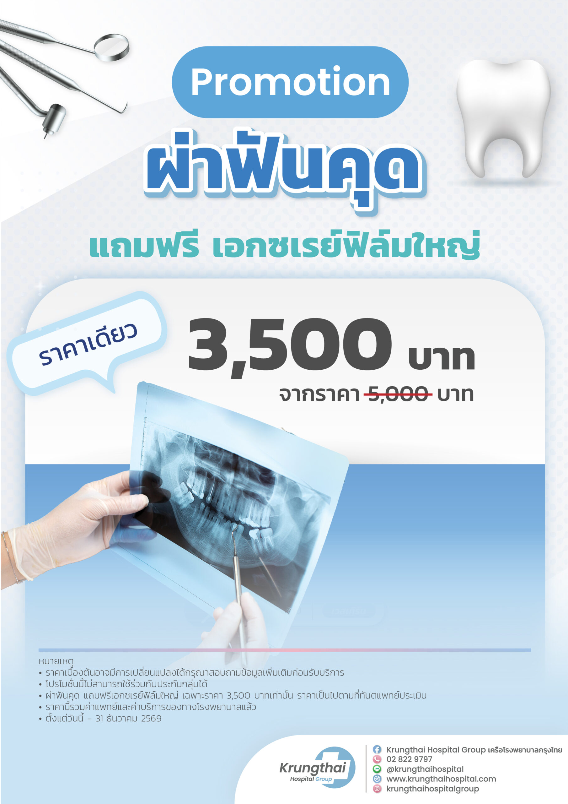 - ผ่าฟันคุด แถมฟรีเอกซเรย์ฟิล์มใหญ่ เฉพาะราคา 3,500 บาทเท่านั้น ราคาเป็นไปตามที่ทันตแพทย์ประเมิน