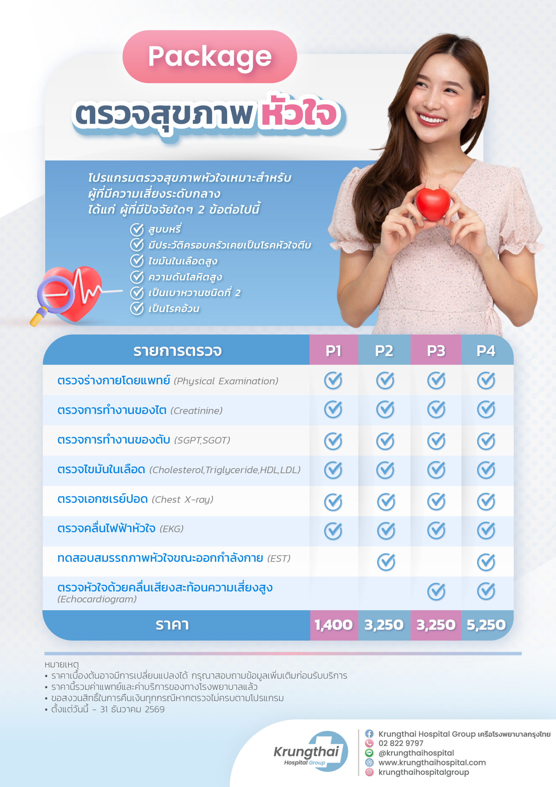 แพ็กเกจตรวจสุขภาพหัวใจของโรงพยาบาลกรุงไทยครอบคลุมการตรวจวินิจฉัยโรคหัวใจเบื้องต้น ด้วยทีมแพทย์เฉพาะทางและบุคลากรทางการแพทย์ที่มีประสบการณ์และมีความชำนาญพร้อมให้การดูแล เครื่องมือที่ทันสมัย อุปกรณ์การแพทย์ที่ครบครัน ปลอดภัยและได้มาตรฐาน ให้ความมั่นใจว่าจะได้รับการบริการที่ดี อีกทั้งยินดีให้คำปรึกษา คำแนะนำการดูแลตัวเอง เพื่อช่วยลดปัจจัยเสี่ยงที่นำไปสู่โรคหัวใจอีกด้วย