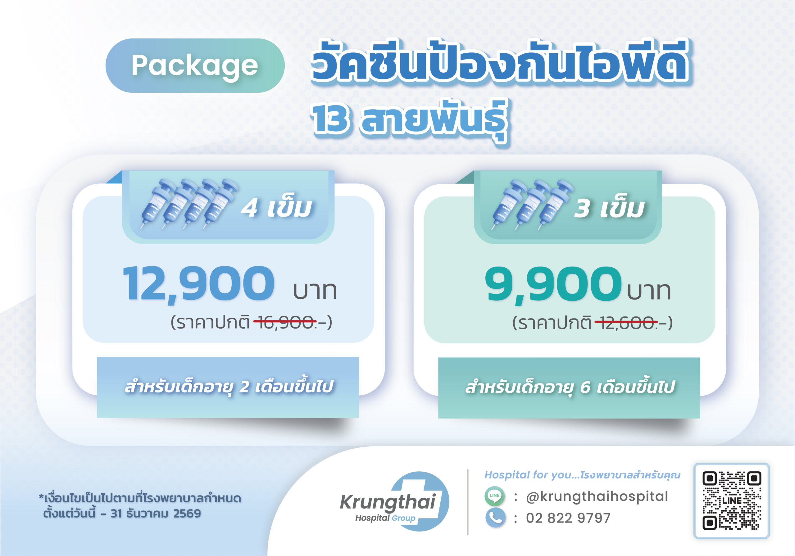 - สำหรับเด็ก อายุ 6 เดือนขึ้นไป ฉีด 3 เข็ม ราคา 9,900 บาท